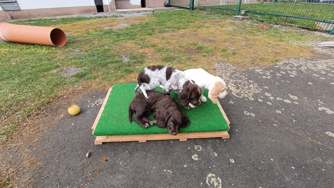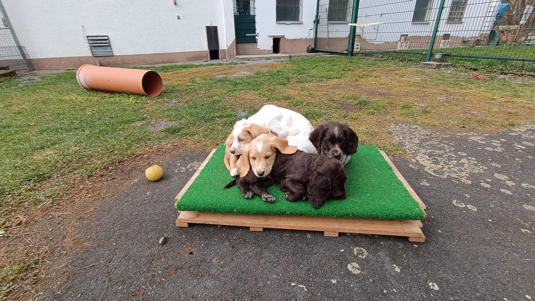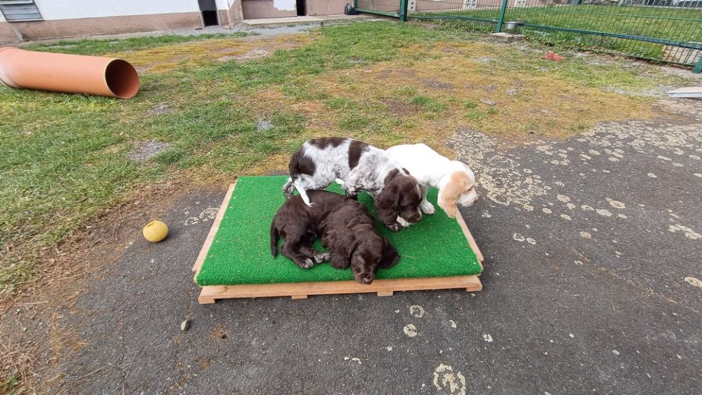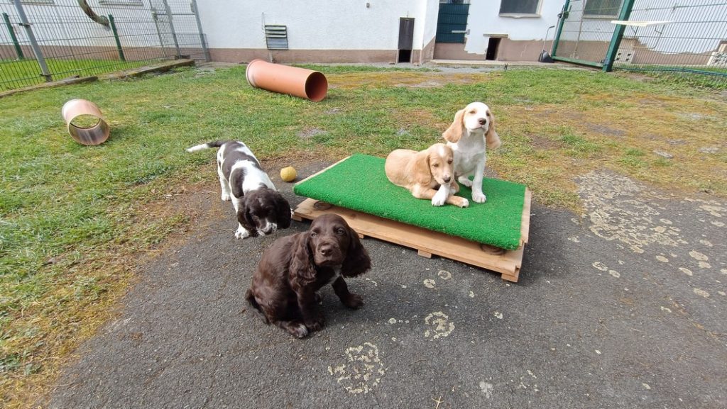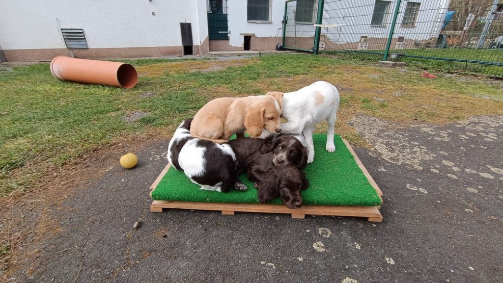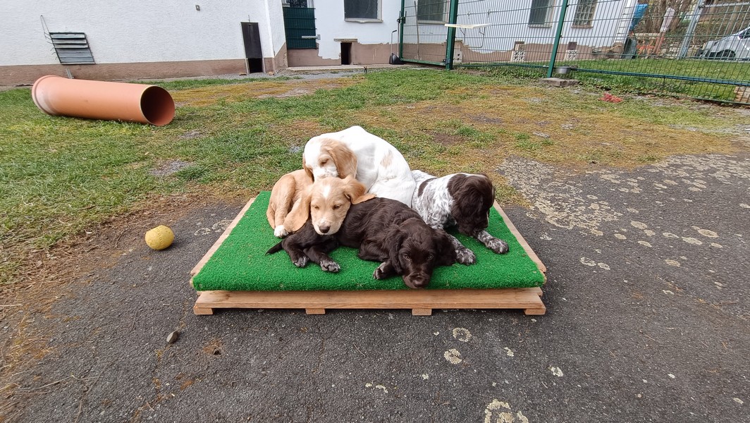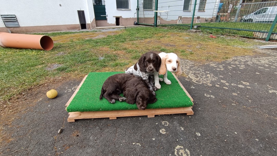 Das Gitter am Eingang mussten wir schon gegen ein höheres wechseln, die ersten Welpen sassen schon vor dem Terrassenfenster.